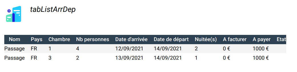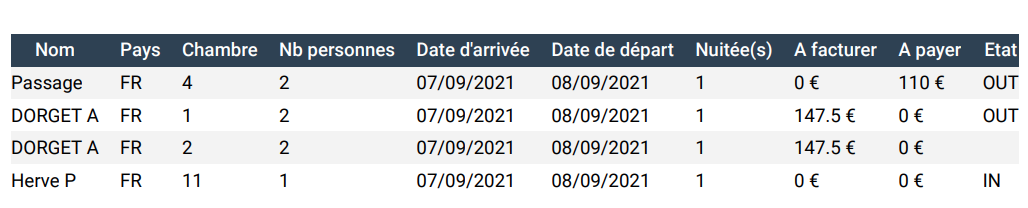À l'inverse du tableau des arrivées, vous aurez le détail de toutes les réservations en départ ce jour (ou à la date sélectionnée).