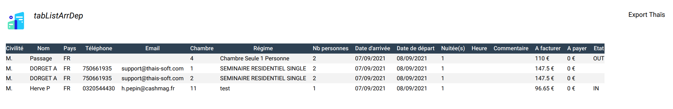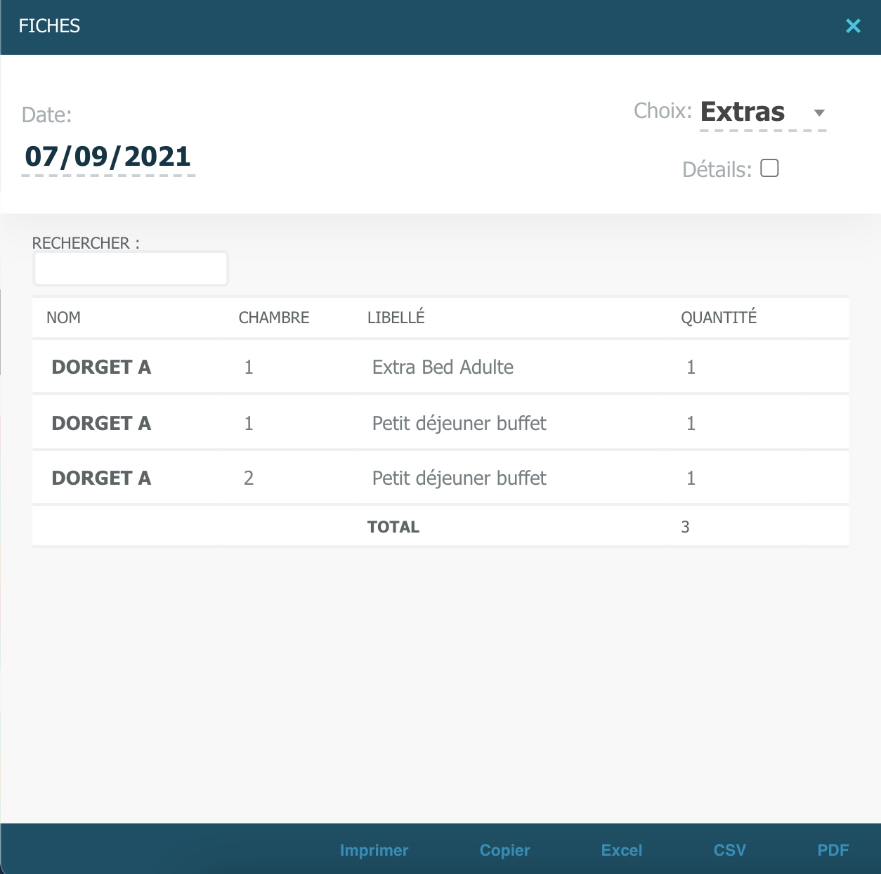 Grâce à la fiche des arrivées vous pourrez afficher un récapitulatif détaillé ou non, des clients en arrivées ce jour (ou à la date sélectionnée).